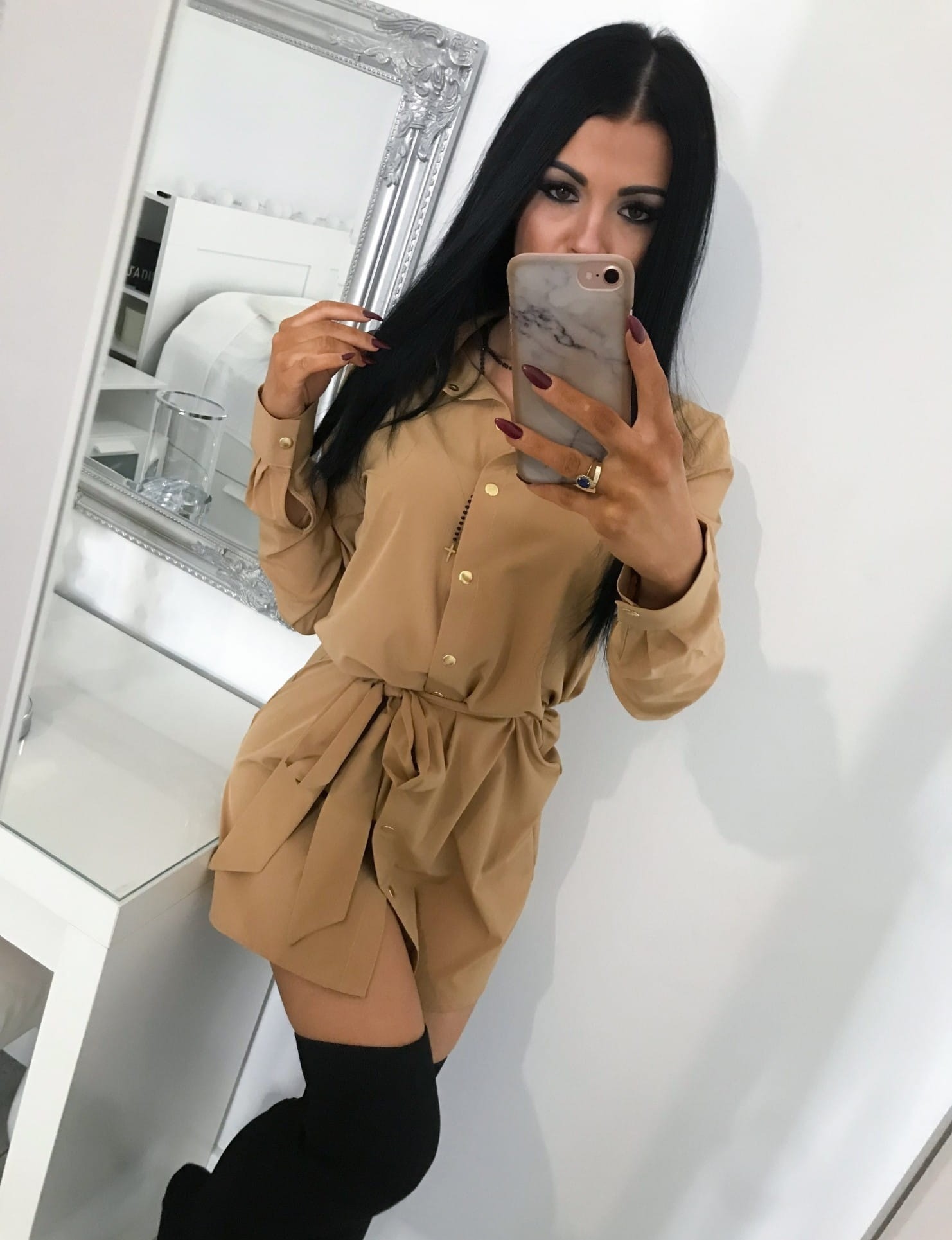 Sukienka koszulowa zapinana na złote guziki z kołnierzykiem. W pasie możliwość regulacji paskiem. Materiał elastyczny.