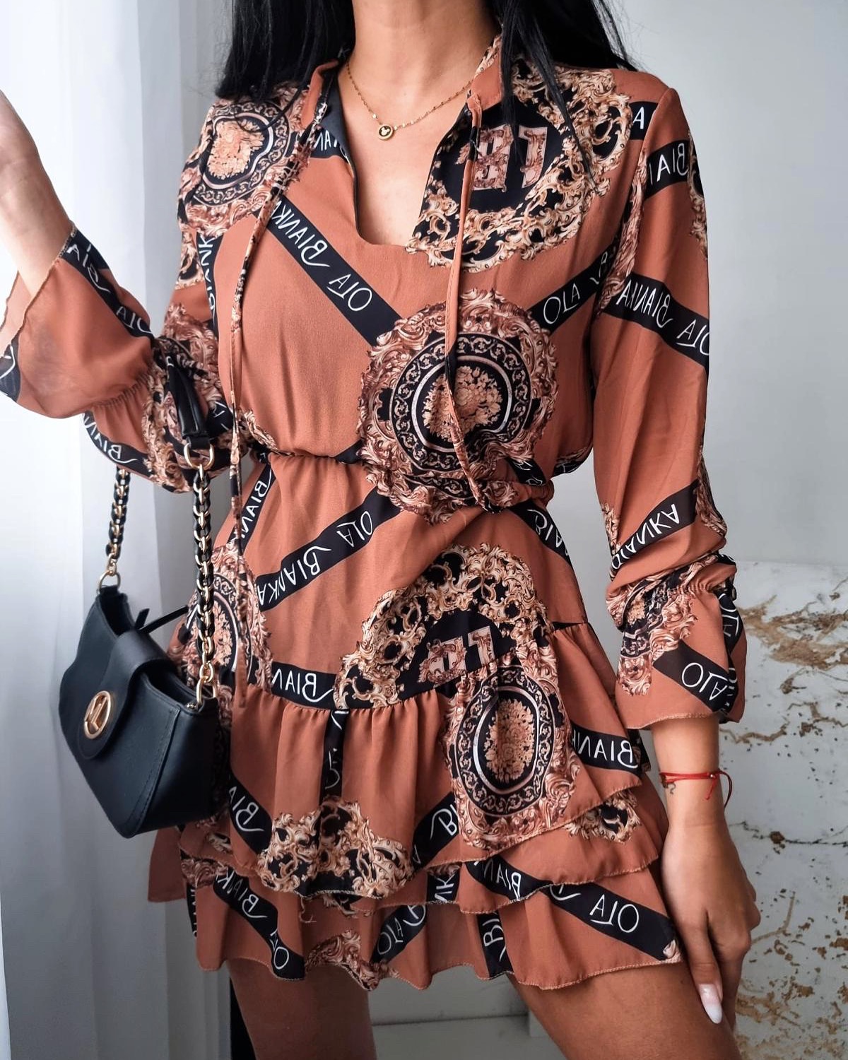 Sukienka Sophia posiada dwie falbanki, które nadają kobiecości, dekolt w literę V, z chwostami, a także gumkę podkreślająca talie.